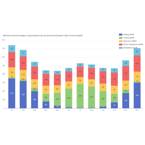 Monthly Home Energy Consumption by Source and Season with Cost Analysis